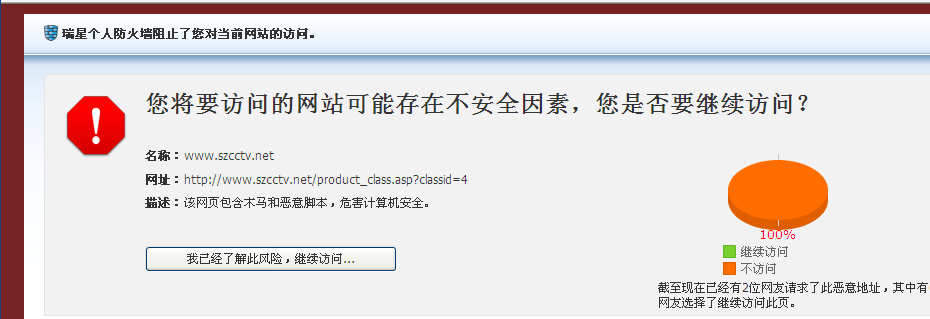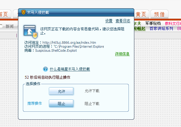 MPEG-2视频0day漏洞吹的沸沸扬扬,今天咱就看看瑞星如何抵御该攻击。找了一个挂马网站,点击进入。被防火墙直接给过滤掉了。