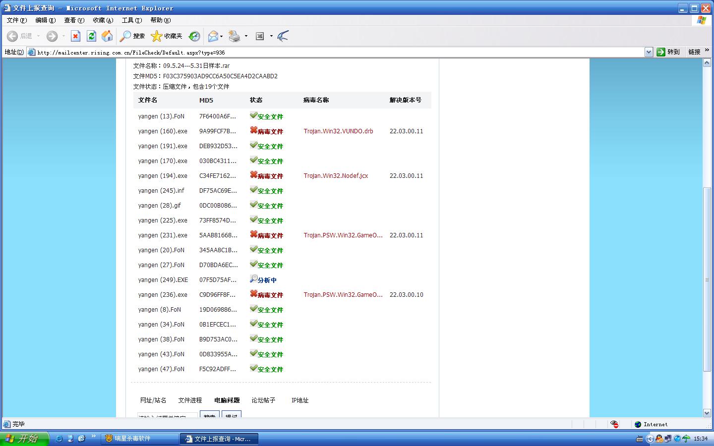 到目前为止,瑞星2010共查杀掉我上报的样本文件中的四个病毒文件内的四个病毒(注:其中包括图九的查询结果中还处在分析中的样本文件yangen(249).exe中的病毒Trojan.Win32.Generic.11E992AA,关于它的的查杀,早在测试瑞星2010查杀未知病毒的第一个和第二个报告中说过)。目前,还有一个已分析诊断到的病毒文件yangen(194).exe中的病毒Trojan.Win32.Nodef.jcx未查杀到。但我想在后续的软件版本升级中也会马上查杀掉的。