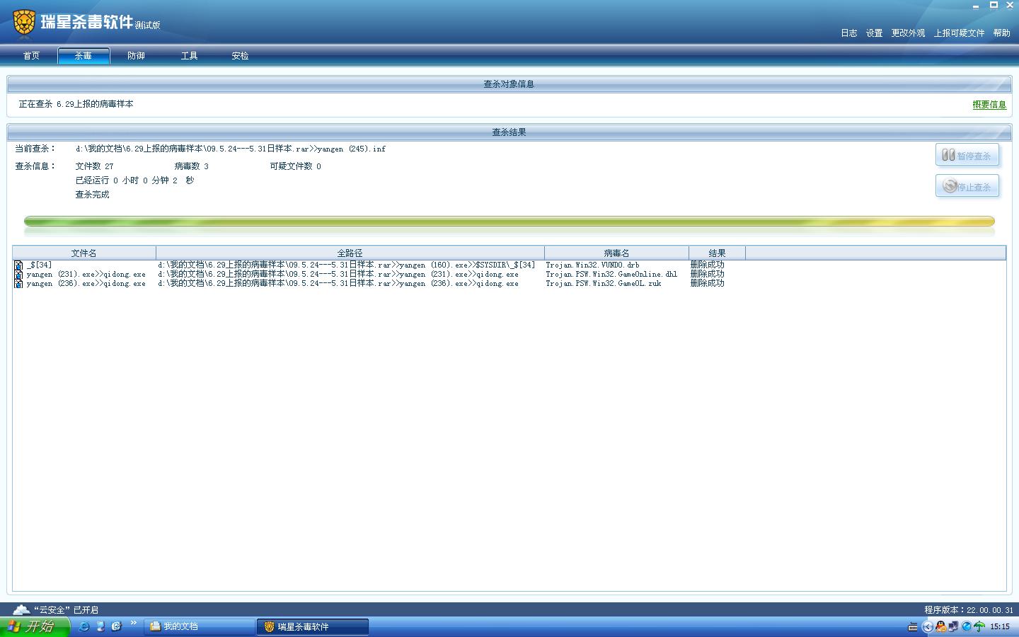 我于是马上把杀软病毒库版本升级到22.03.01.11,再来查杀上报样本文件中的病毒。结果喜人!瑞星2010成功地把分析诊断到的四个病毒文件的其中三个病毒文件内的三个病毒查杀。查杀结果见下面图十的截屏: