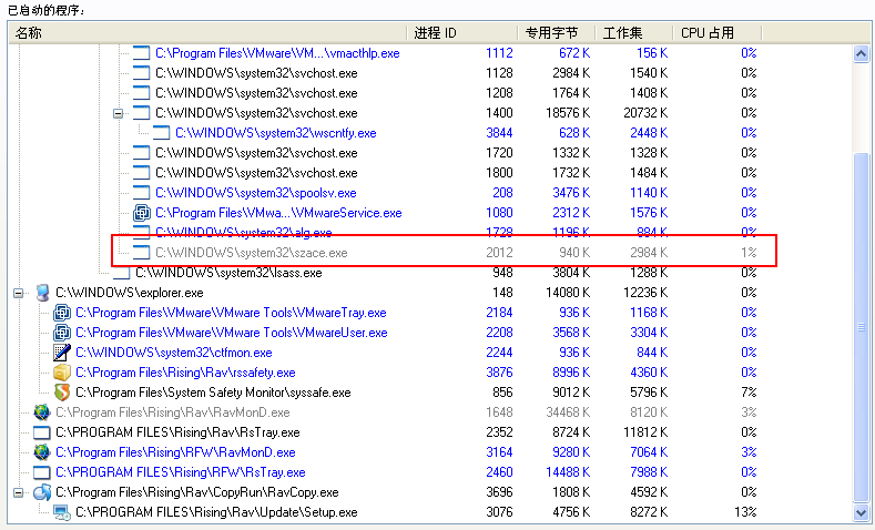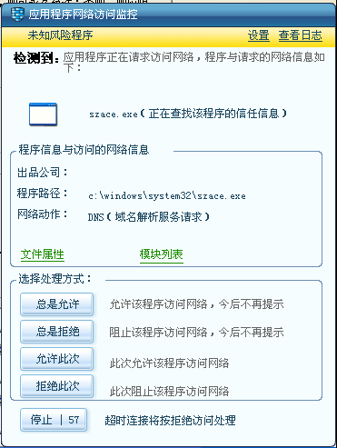 然后启动C:\WINDOWS\system32\szace.exe并试图联网,被瑞星防火墙拦截,删除自身,重启计算机后,szace.exe被成功加载。