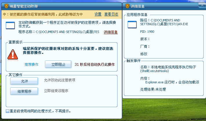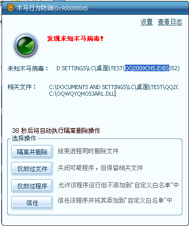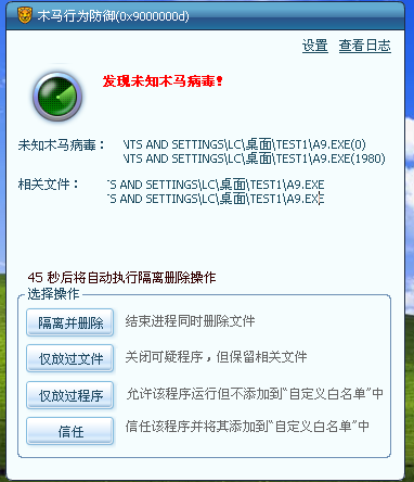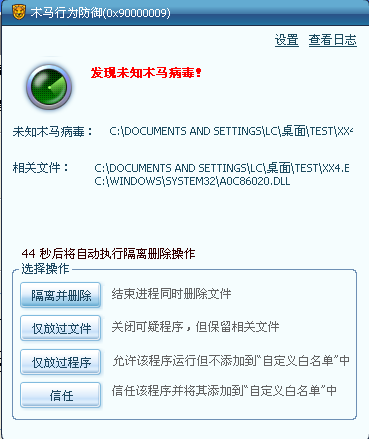 该实例很好地证明了木马行为防御的智能化及人性化,经过对病毒一系列行为的监控,最后将病毒歼灭。