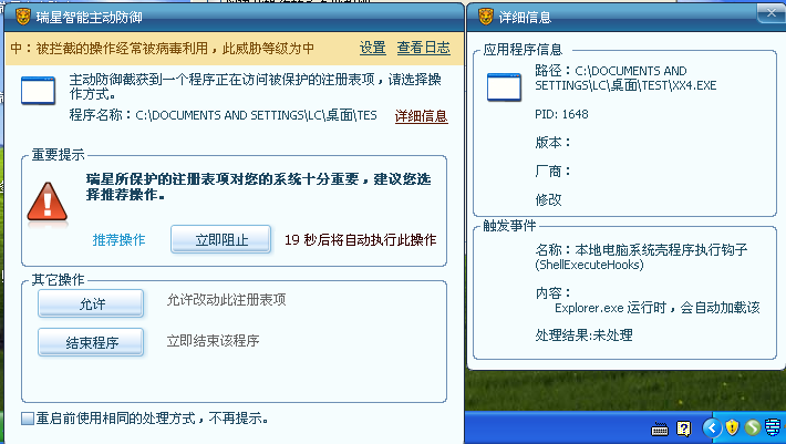 瑞星的主动防御未拦截。