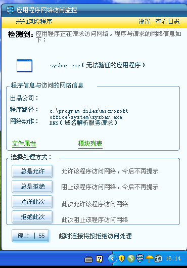 防火墙拦截了sysbar.exe的联网行为,瑞星的主动防御未拦截。