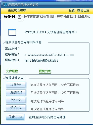 防火墙拦截到xttp6J11x.exe的联网行为,瑞星的木马行为防御未拦截。