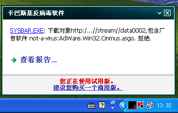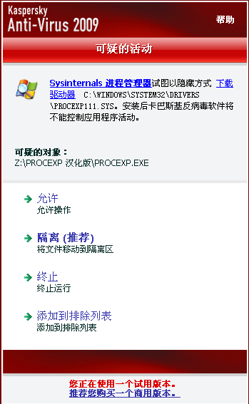 病毒被卡巴斯基的主动防御成功拦截。