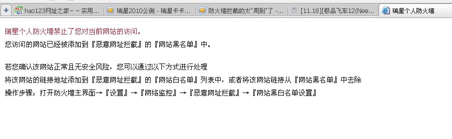 拦截了,说是恶意网址。其实拦了也可以点继续浏览嘛,我相信瑞星,不继续浏览了