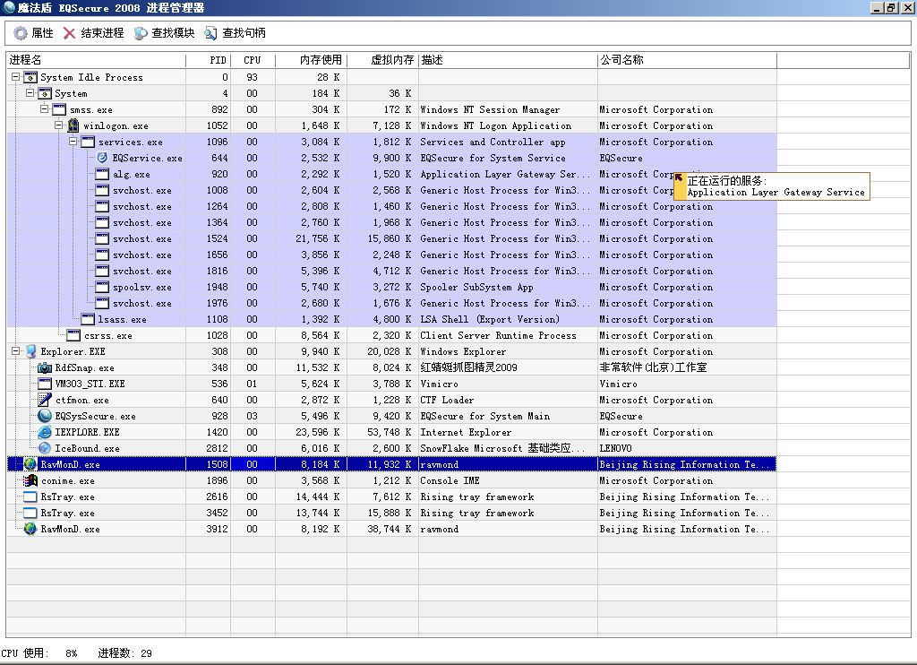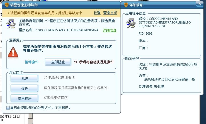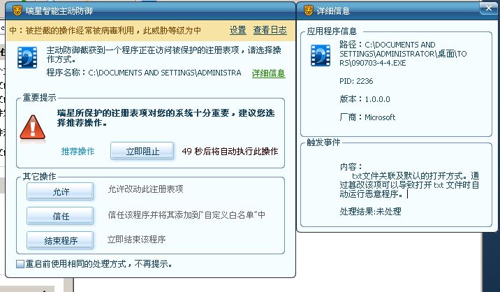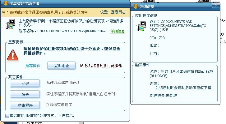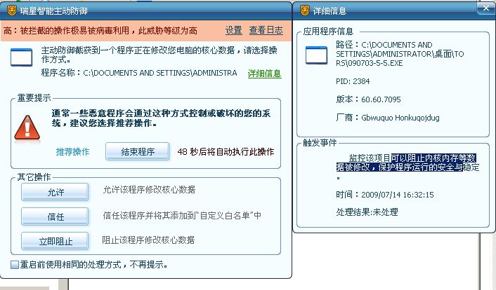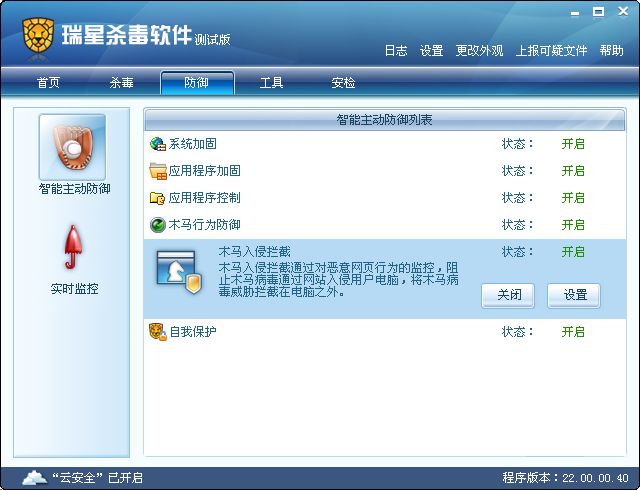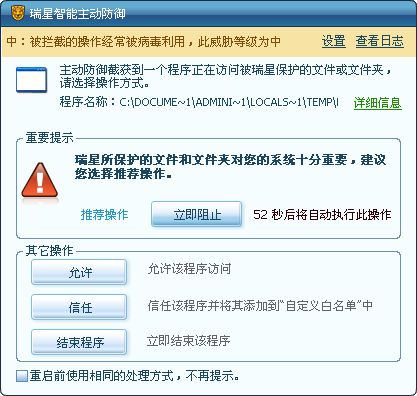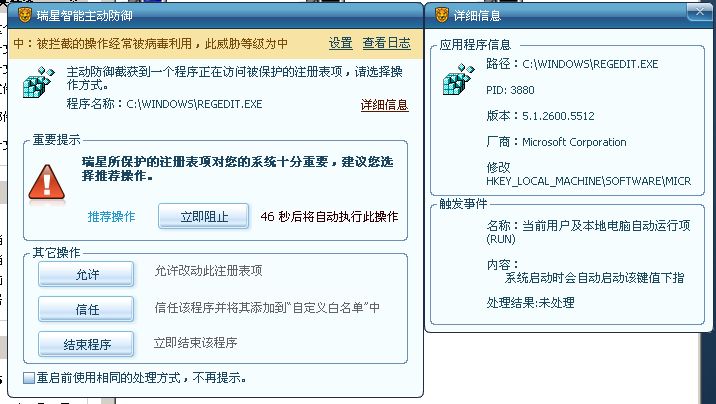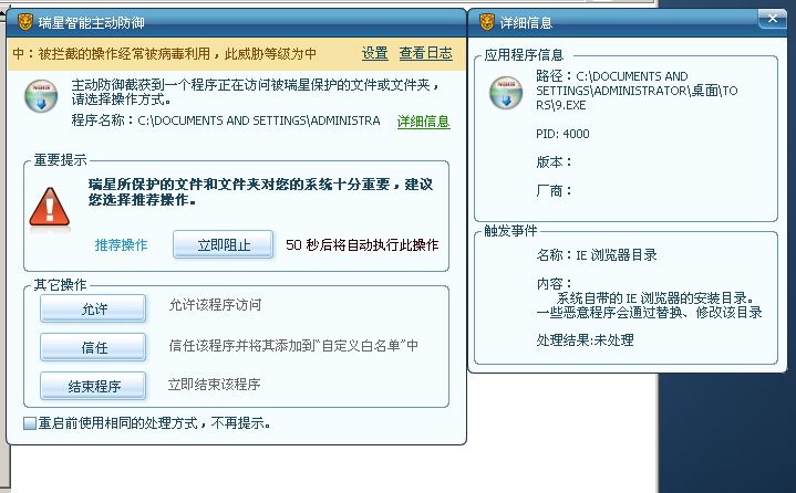 总得来说 瑞星的主防还是不错的 瑞星主防现在的方向不再是像江民那样的简单HIPS了 而是走行为分析的道理 系统加固的作用只是查缺补漏而已 但唯一不足的是恶意行为防御触发几率比较小 希望瑞星以后可以再完善下行为防御的规则