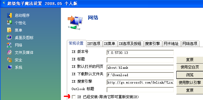 昨晚好不容易卸载了IE 7,恢复到IE 6,今早我也不知怎的来到超级兔子中将”IE已安装(取消它即可重新安装IE)“前面的勾去掉——原本它是勾上的(图1),结果在下次开机后,进入桌面前突然弹出一对话框”IE 6已成功从计算机上删除,是否需要删除个人设置“,我想既然已删除了,那就删除吧,于是选择了”是“,之后进入桌面,但越想越不对劲,怎么会删除IE 6呢?昨晚不是删除的是IE 7吗?我这才回想起刚才取消了超级兔子中那个选项,可能是那选项执行的结果吧!于是赶紧把”IE已安装(取消它即可重新安装IE)“勾上。点击桌面的IE图标打开IE 6,发现它又能正常打开网页,但速度稍微慢了些,其它方面也没有出现异常。因为原先一直使用的是IE 7,于是我在下午将IE 7安装在了电脑上。