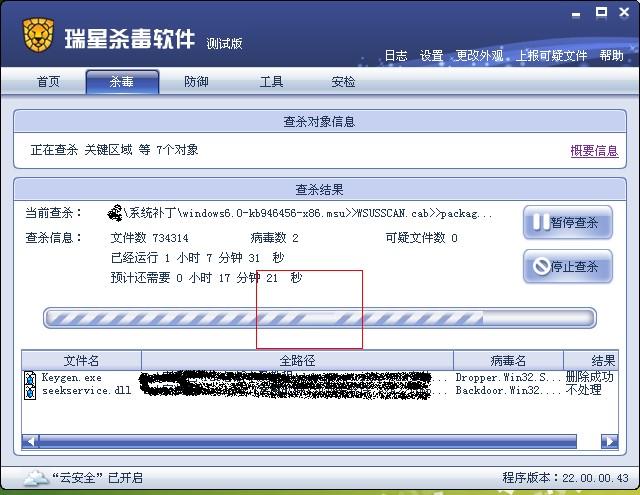 还有杀毒的时候主界面很卡,,我个人认为是瑞星全部集中到一个界面的所以比较卡,,希望瑞星能分开界面与节目的关系,,太死板,全部集中在一块,,很不灵活