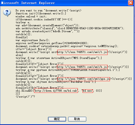 上图中红色框中,我们看到有3个js脚本(已失效),有效地址为:http://down.dj7788.cn/bd.cab和http://down.dj7788.cn/bd.exe。