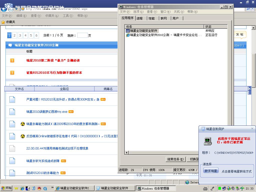 这是全功能软件进程未响应但是瑞星自我保护还在生效导致,问题已收集,感谢您的支持,请继续测试瑞星2010版