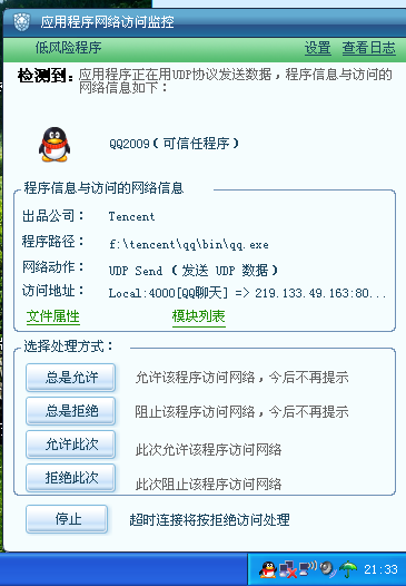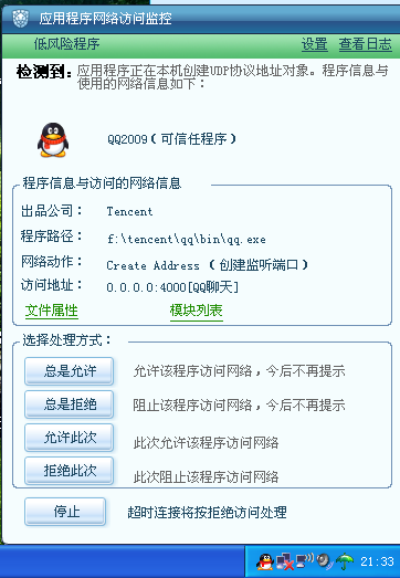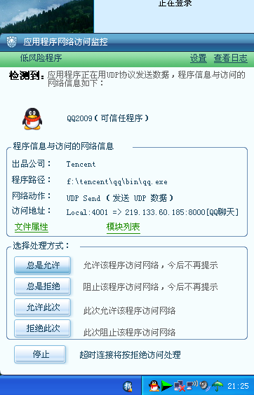 无奈以上图1-1,图1-2,图1-3,不断重复出现,全点击“总是允许”,无法关闭,一直不停出现这些对话框,最后只出现图1-3所示对话框,IP地址不相同,N次以后,再接着出现下图1-4对话框,IP相同,内容完全相同,无法退出,除非先结束QQ2009进程,再点击“停止”按钮。总之QQ是无法登录的。图1-4: