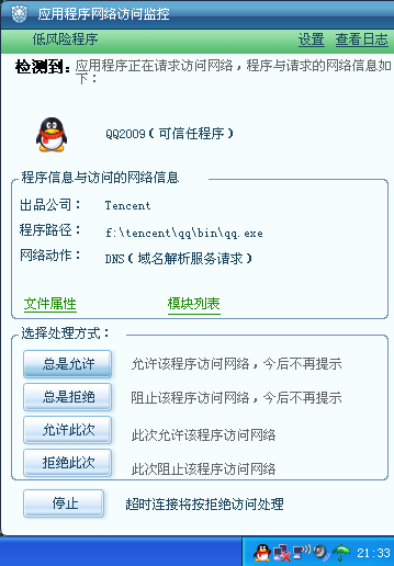 图1-1,处置登录QQ2009,提示dns域名解析。选择“总是允许”。