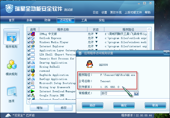 瑞星软件版本:程序版本:22.00.00.44,病毒库版本:22.05.00.18