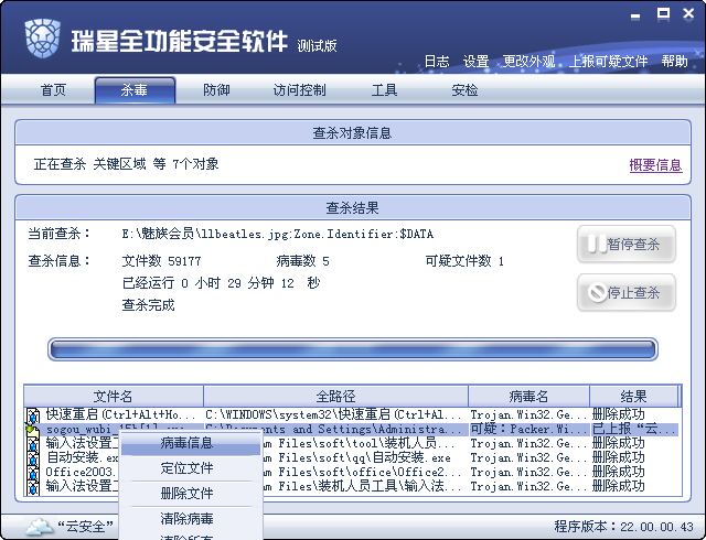 以下是战况。经查杀判断好多程序包带毒,包括我下载的搜狗五笔?会不会是误报。