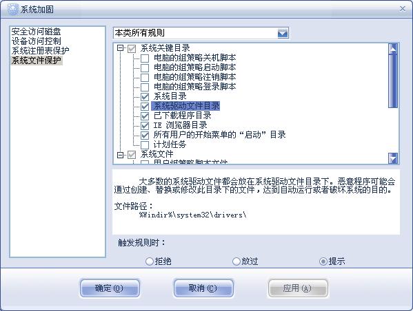 让我感到奇怪的是,在同时开启系统加固的时候,病毒在system32下、drivers下创建文件均未见提示,是不是担心和木马防御重复?弹出提示框太多,影响用户操作?