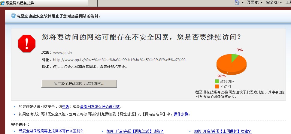 打开pplive网页视频后,瑞星都要拦载,提示为恶意网站或有木马。