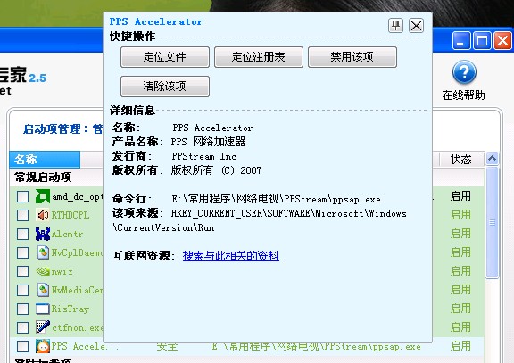 PPS网络电视软件中的PPSAP加速器软件,启动PPS时每次都会修改注册表启动项