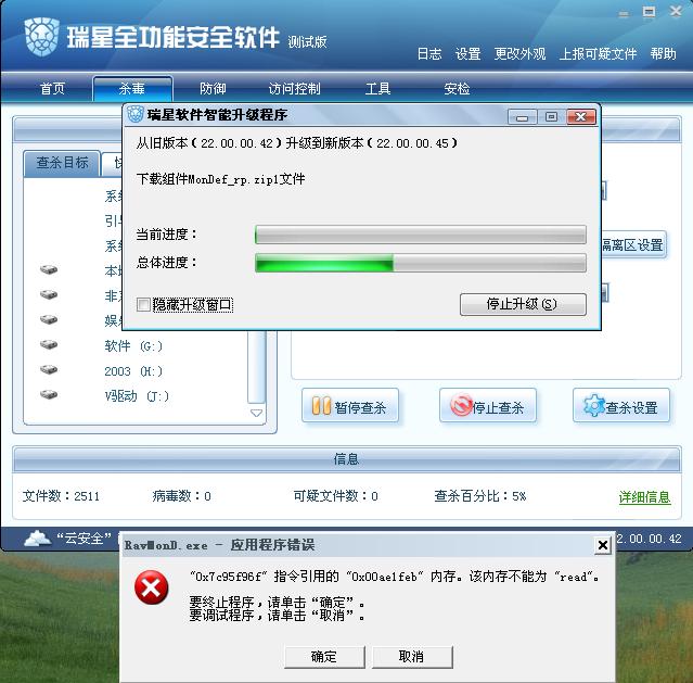 今天抢到瑞星2010全功能测试版的序列号,马上卸载了2009,安装一切正常。重启后扫描电脑,发现提示电脑系统安全系数较低,原因为系统有漏洞。点击修复,瑞星卡卡启动,扫描后未发现漏洞(昨天瑞星2009全功能软件提示有5个漏洞,当时就马上修复了)。点击瑞星卡卡的一键搞定,让它自动运行。然后启动全盘扫描,想看看速度比较2009有没有提升,正在扫描的同时,开启软件升级。大约过了20秒。出现了RAVMOND.EXE程序的内存不能为read的提示。这时有瑞星卡卡,瑞星全盘扫描和瑞星升级同时在运行。
