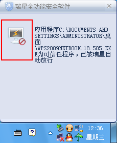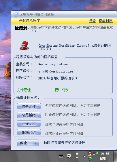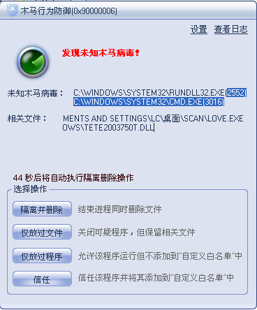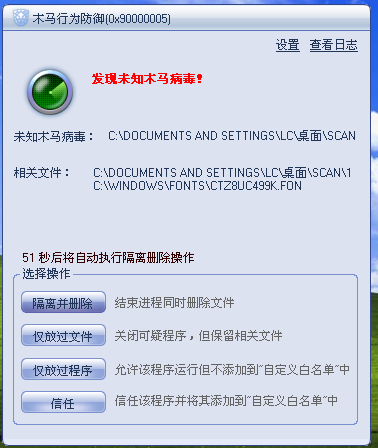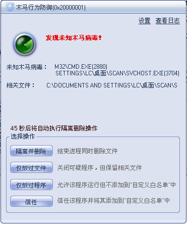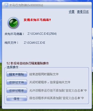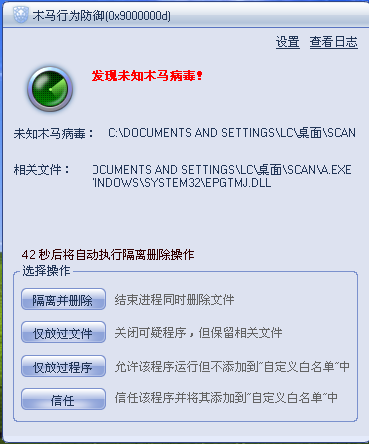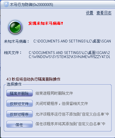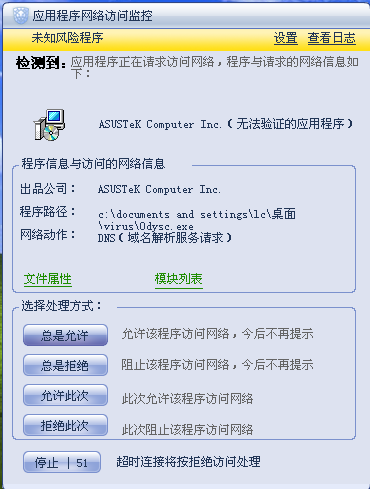 RIS2010的防火墙将其拦截。KIS2010的应用程序活动控制能阻止该病毒运行,关闭应用程序活动控制后,KIS2010的主动防御提示:行为类似PDM.Trojan.generic。