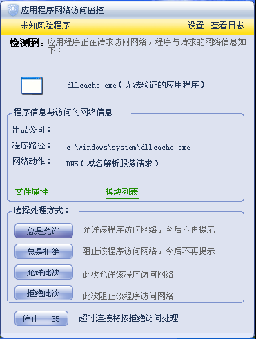 该病毒会释放dllcache.exe,修改核心内存,存在联网行为。