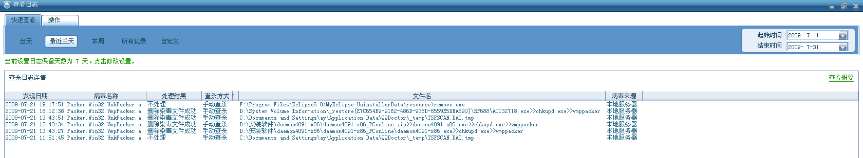 首先如图,在上面两个位置查到病毒后,不能自动杀毒,而且查看历史记录的时候不能直接转到病毒所在文件夹,不很科学。另外想请教大家,那两个文件时病毒吗?