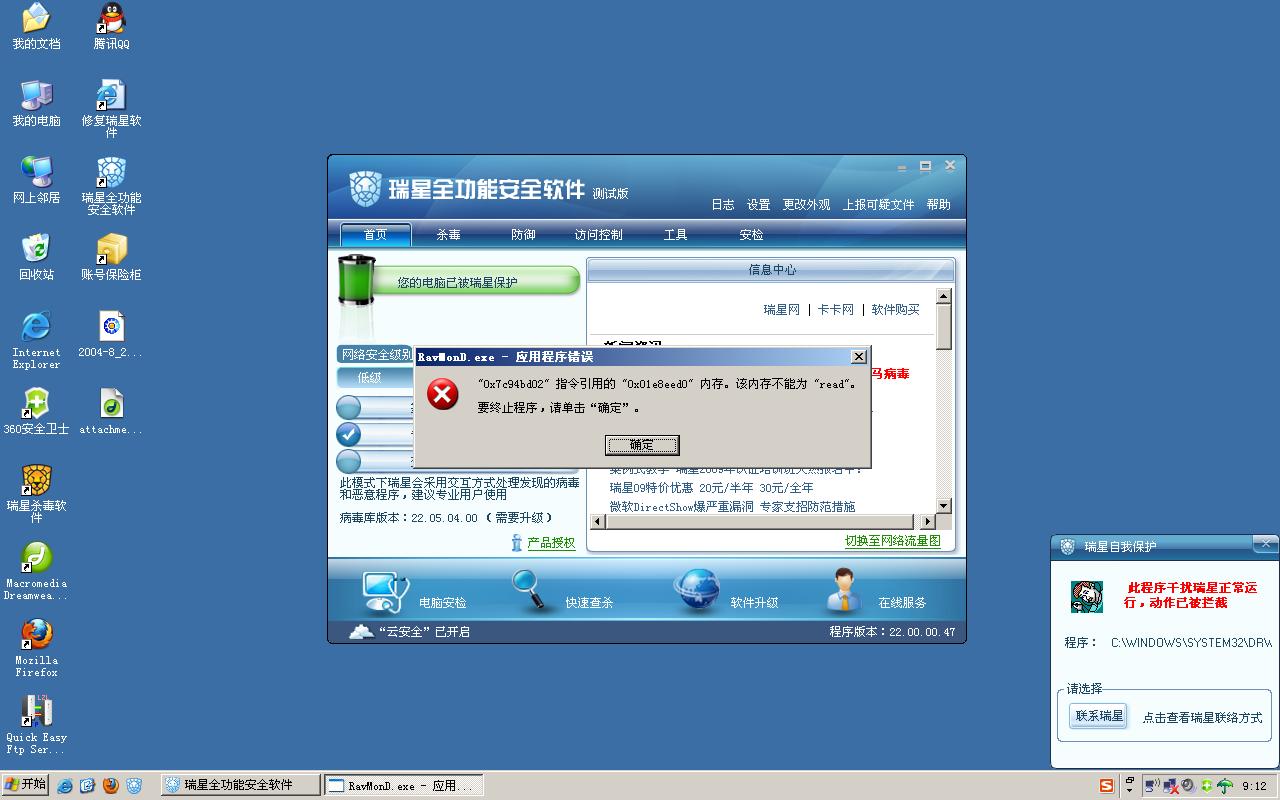 瑞星严重错误提示“应用程序错误”-监控被关掉