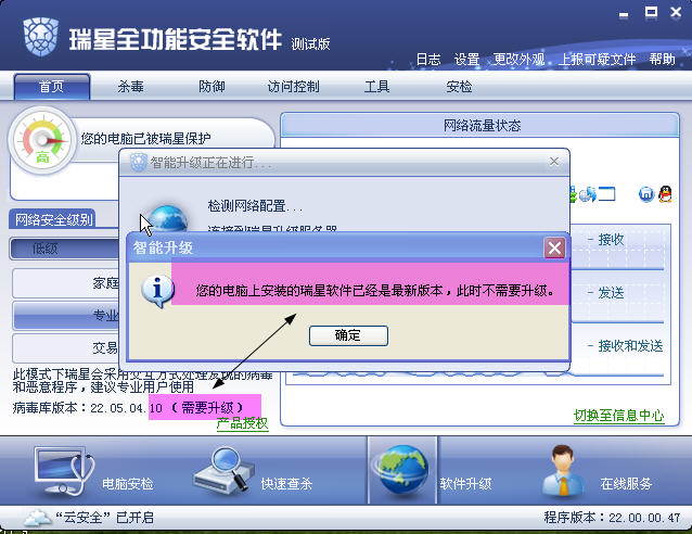由于升级的取消导致没有升级到最新版本,下面病毒库版本处会提示“需要升级”,但是运行软件升级会提示不需要升级。