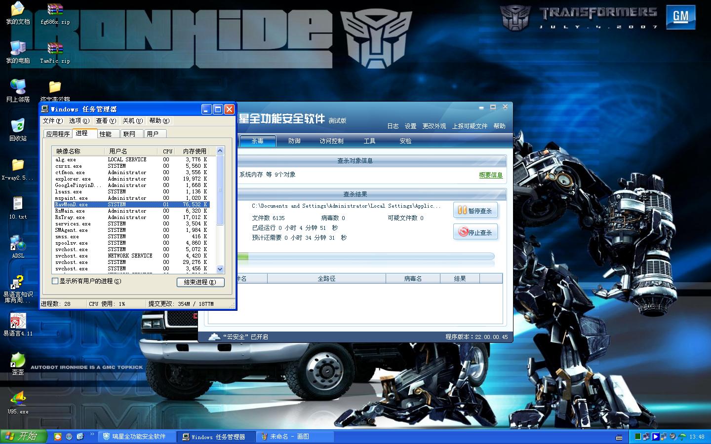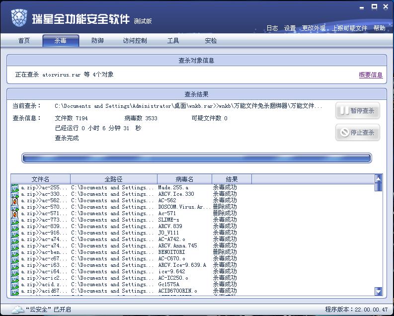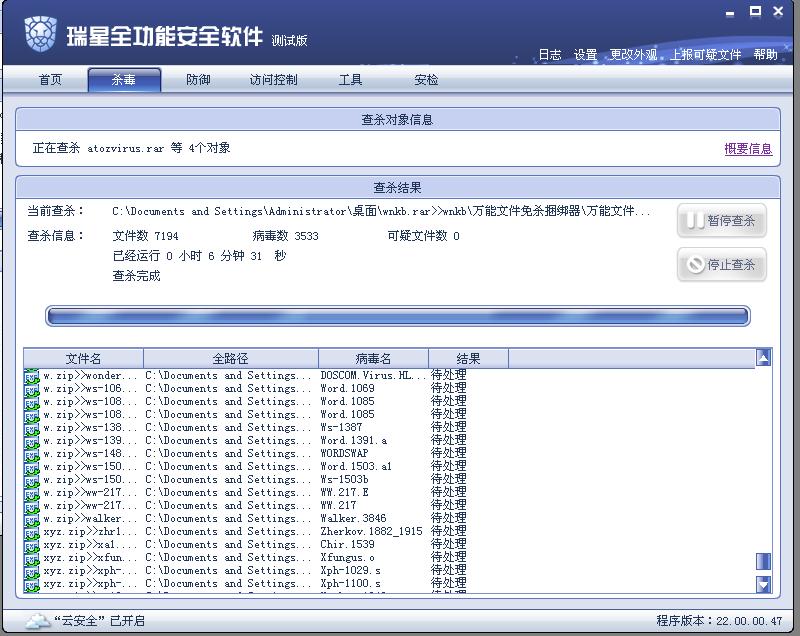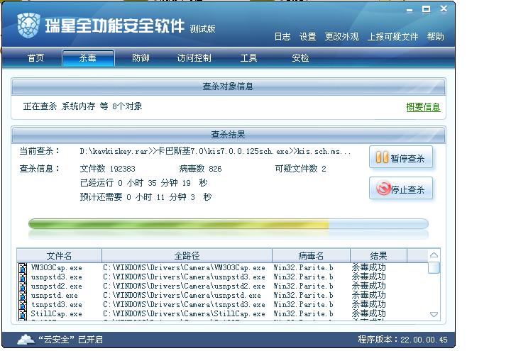 占用比此前版本有很大的优化但是依旧是资源浪费严重,为了每次测试杀毒不得不重启多次,不知道什么是云系统但是有个大单的设想,如果能和谷歌搜索引擎一样的搜索能力,那就非常完美了。瑞星主动查杀的能力个人感觉还是不如卡巴斯基,在代码实验阶段卡巴一复制就提示有病毒,在暴力实验阶段瑞星查杀的数量远远比其他杀软多