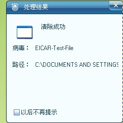在安装防毒软件的计算机上通过网络下载或是运行 EICAR 标准防病毒测试文件,即可测试防毒软件的运行是否正常。当您的软件扫描该文件时,将报告发现 EICAR 测试文件。