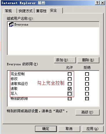 再右键点击IE快捷方式-----------属性----------安全里,添加权限(勾上完全控制即可)