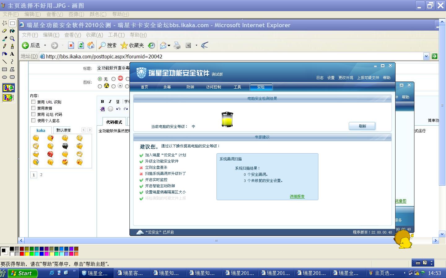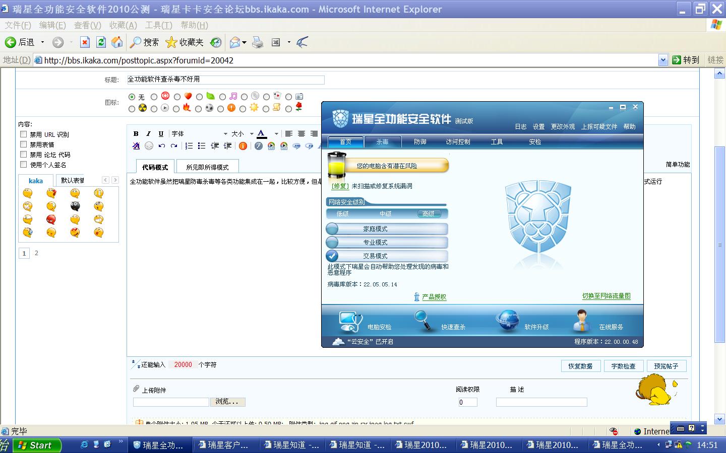 全功能软件虽然把瑞星防毒杀毒等各类功能集成在一起,比较方便,但是查杀毒不好用,主页的初级、中级、高级和家庭模式、专业模式、交易模式等都没有确认按钮。选择后不知道能否按新模式运行,另全盘查杀无法实现,见截图