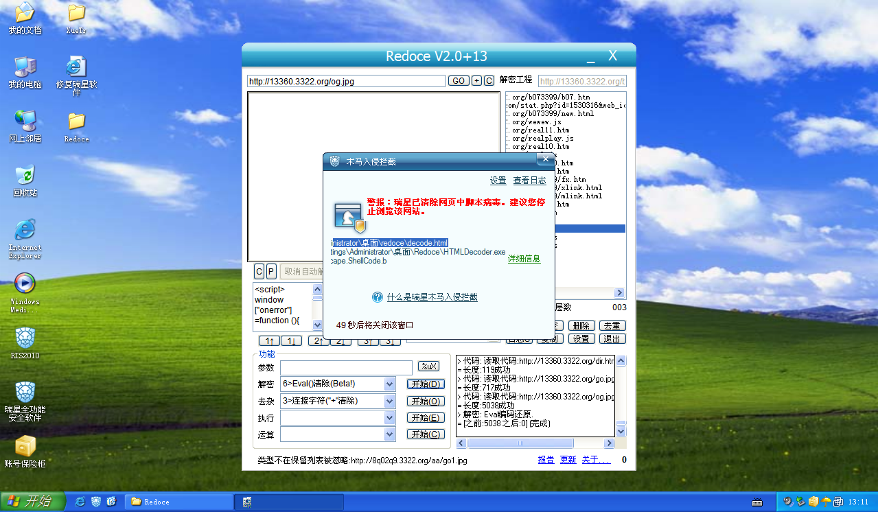 由此可见,只要调用IE的核心便逃不过瑞星的拦截。这一点不妨表扬下。别的杀软都是吧网页病毒列入文件监控,如检测到文件下载便删除。