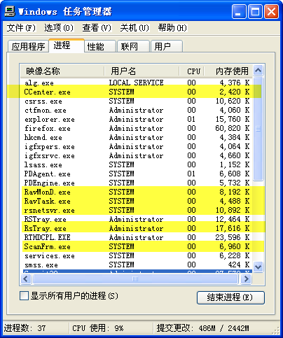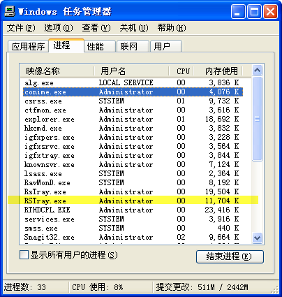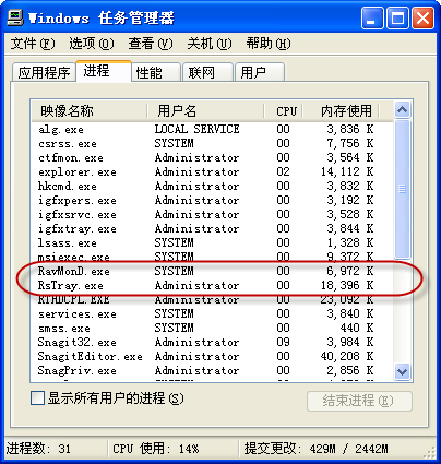 在默认设置下,RIS10有两个进程,这个相对于09版来说应该有很大的进步。进程名称和占用的内存如下图: