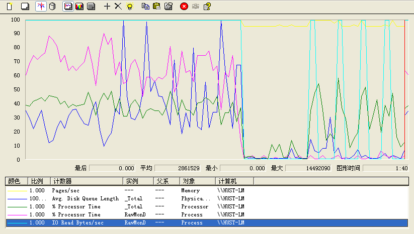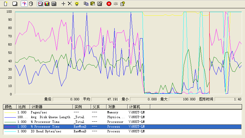 扫描时未进行其它工作,我用系统自带的性能查看器进行监控,下边给出结果。