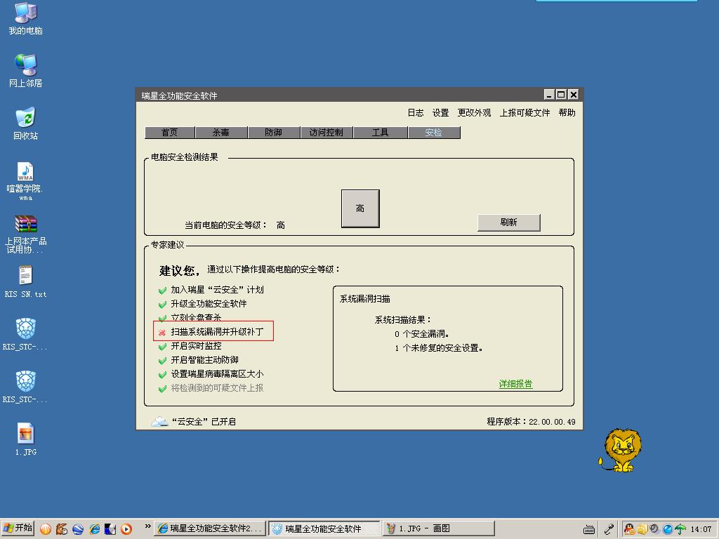 例如全盘扫描,很多人都不执行,一直是红叉,但最终结果是还是“高”安全级别