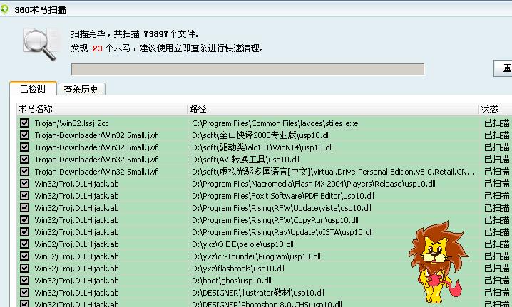 RX2009/2010全盘杀毒后再使用360竟然还有23只木马。