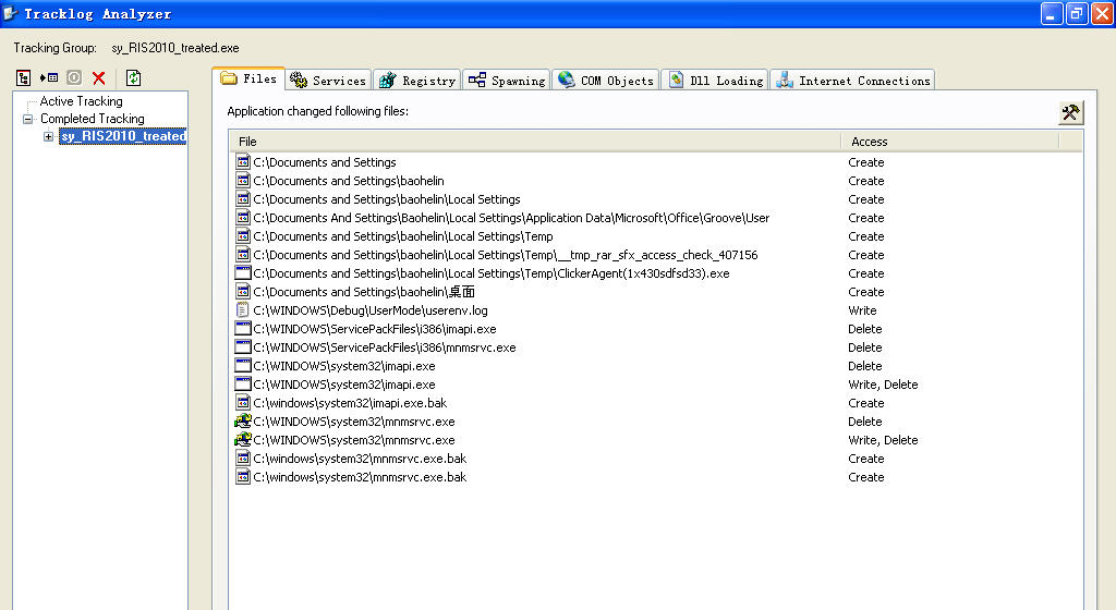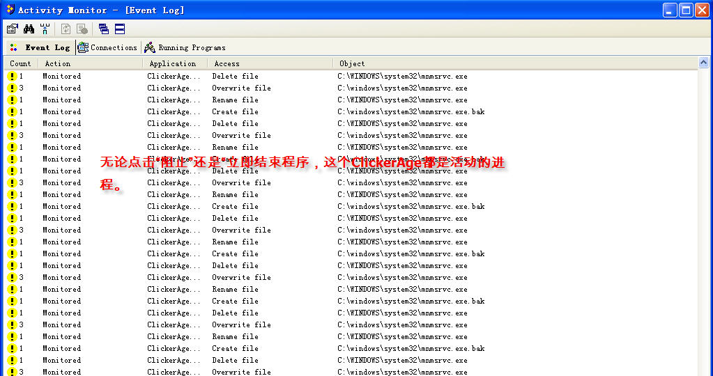 再往下看,病毒释放到当前用户临时文件夹中的ClickerAgent(1x430sdfsd33).exe已经运行起来了。此时,RIS2010主动防御报警,但无论用户点击“阻止”还是点击“立即结束”,这个进程并不能立即死掉。