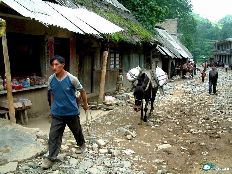 图为大水乡一个汉子正从街上匆匆走过。他赶了两个小时的山路是为了卖点玉米。如果运气好的话,他可能卖得15元现金。除了买两斤盐回家,剩下的钱要攒起来做孩子下学期的学杂费。如果一个暑假攒不够70元,孩子将辍学。