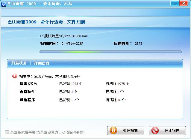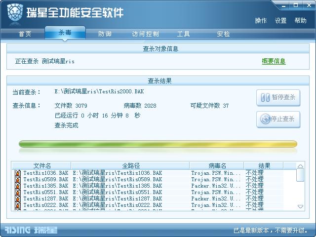 此次查杀中,瑞星全功能安全软件2009版耗时16分08秒