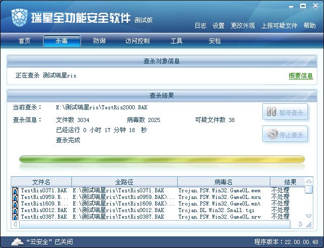 此次查杀中,瑞星全功能安全软件2010测试版耗时17分18秒