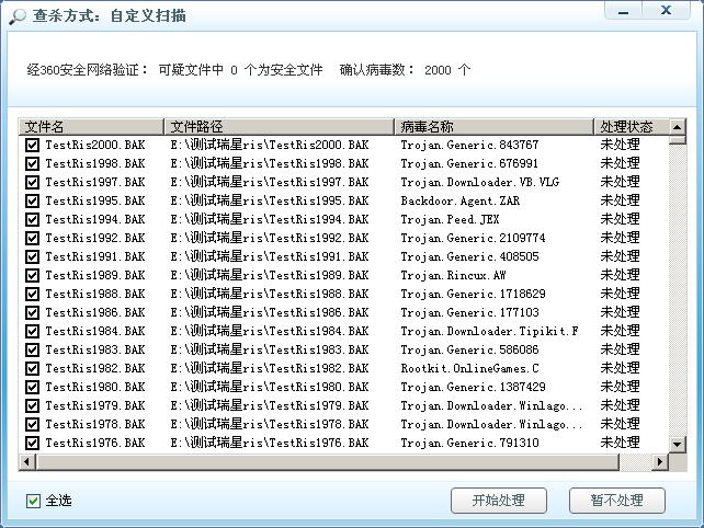 2、参与检测的病毒样本以上软件均能全部查出,以避免少出现未知样本增加检测时间,加大公平性(本来准备检测5000个样本,可在实际操作中有两种杀毒软件的检测率实在太低,再加上其它各种杀毒软件的检测率,最终留下2000个共通的样本,此步骤共花费2小时);