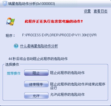 运行ProcessExplorer,RIS提示危险动作(瑞星版本:22.00.00.51)