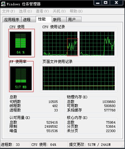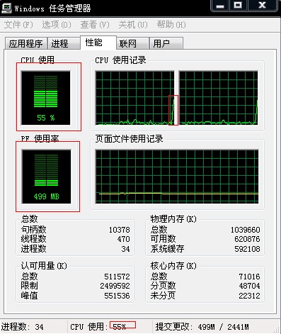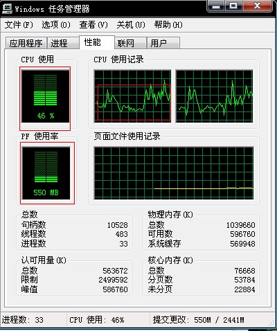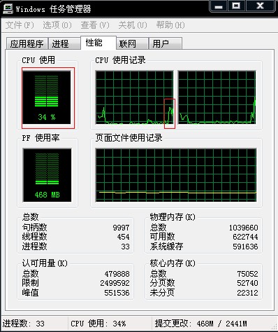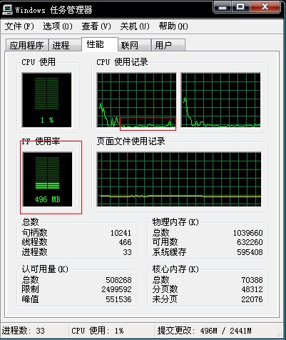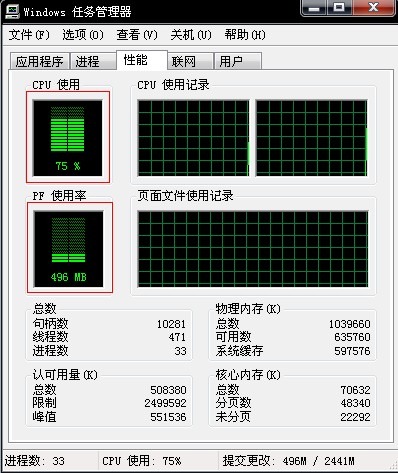 刚启动任务管理器时,cpu使用75%,pf使用率496M。
