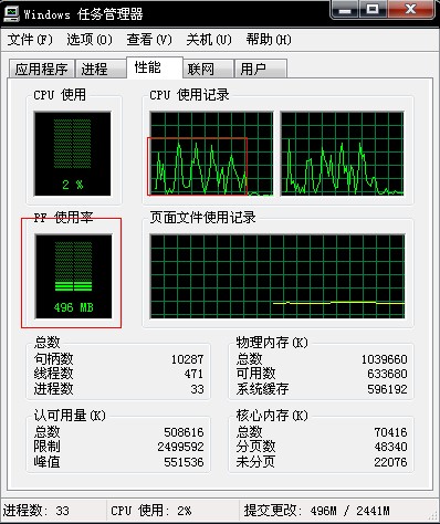 在不做任何操作,cpu处于空闲时,cpu使用为1-3%,pf使用率496M左右。