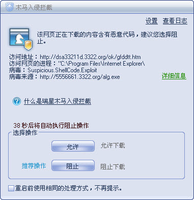 通过对这两个网页的测试,发现瑞重对于不同的挂马网页有不同的防范方式,第一个网页检测到了木马,这个应该是瑞星明确的木马,所以直接提示为木马攻击,第二个网页应该是存在瑞星不确定的因素,所以只说了可能存在不安全因素,最后的网络攻击也成功拦截,这说明瑞星的防挂马功能比较全面,对于不同的攻击方式,可以采用不同的拦截方式,有效保证了我们的计算机的安全。