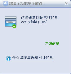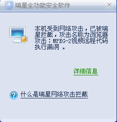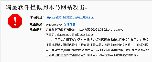 网页提示瑞星拦截了木马网站,并有攻击说明,非常详细。