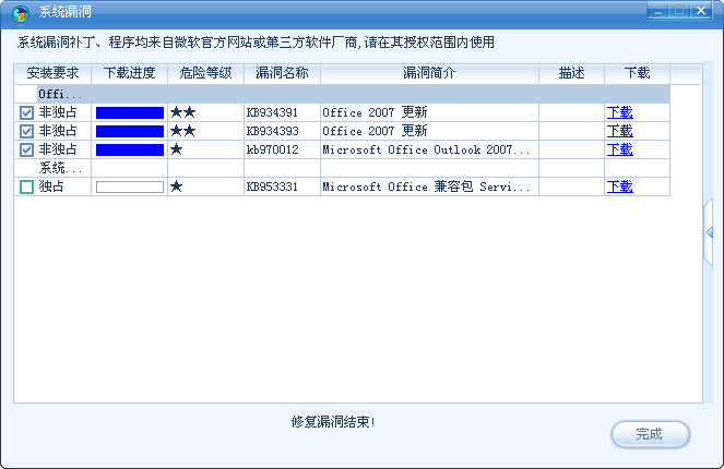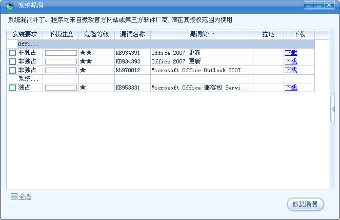 漏洞检测结果太雷人了。我明明安装的是OFFICE 2003,却检测出3年2007补丁。