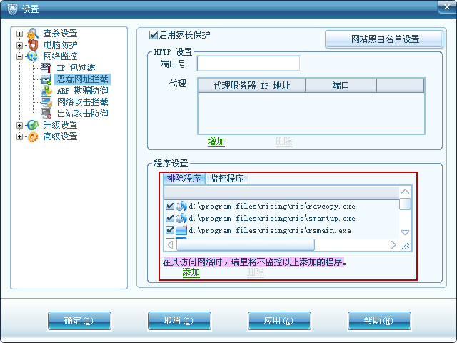 程序设置里有两项,一个是排除程序,一个是监控程序。上图文字说明排除程序里不进行监控。