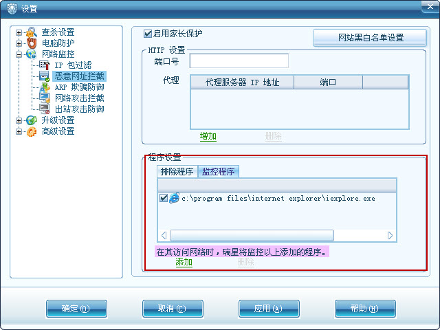不过我感觉它既然是网址拦截嘛,那就是说只要是通过80访问的都监控着。如果有某些不通过80访问网络的程序,你觉得不踏实,也想监控呢,就得放到监控程序那个里。我是这么理解的。